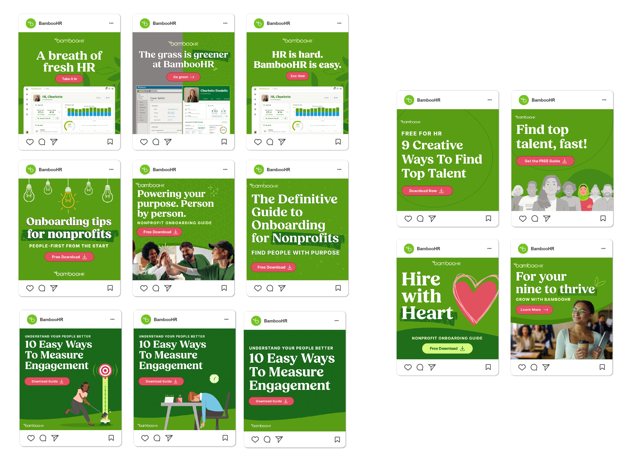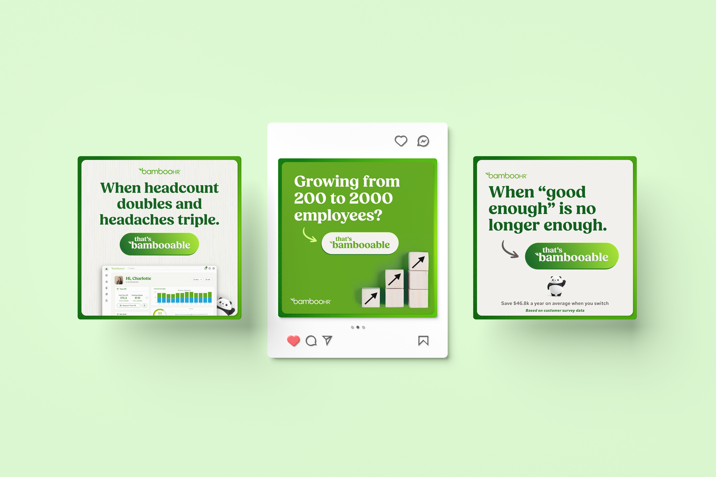 “That’s Bambooable,” is BambooHR’s first campaign under our new creative platform. The work centered on communicating a clear promise: powerful enough to solve real HR problems, yet easy to use—while elevating the brand and building a repeatable system that could flex across scenarios. As lead designer, I was responsible for early exploration and ideation—finding an elevated look and repeatable structure—then carrying the concept through to polished, production-ready OOH and paid media creative, establishing a consistent visual language for future campaigns.