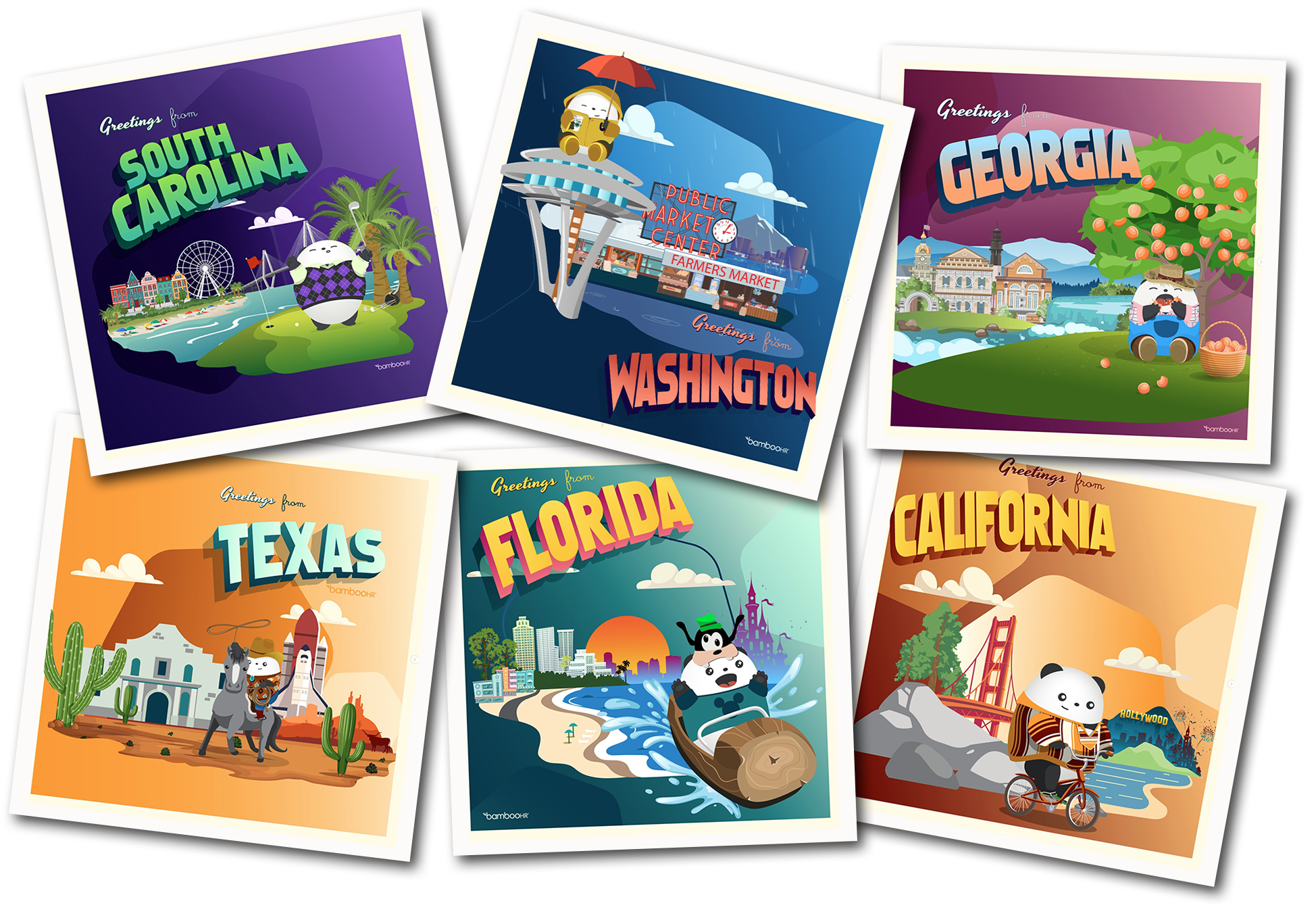 These are vector illustrated assets, highlighting and celebrating where our employees work from and reinforcing BambooHR’s commitment to supporting teams from anywhere. I designed a cohesive, scalable illustration system in Adobe Illustrator, sourcing select elements from Adobe Stock and recreating key components from scratch to ensure consistency, originality, and brand alignment across every state.