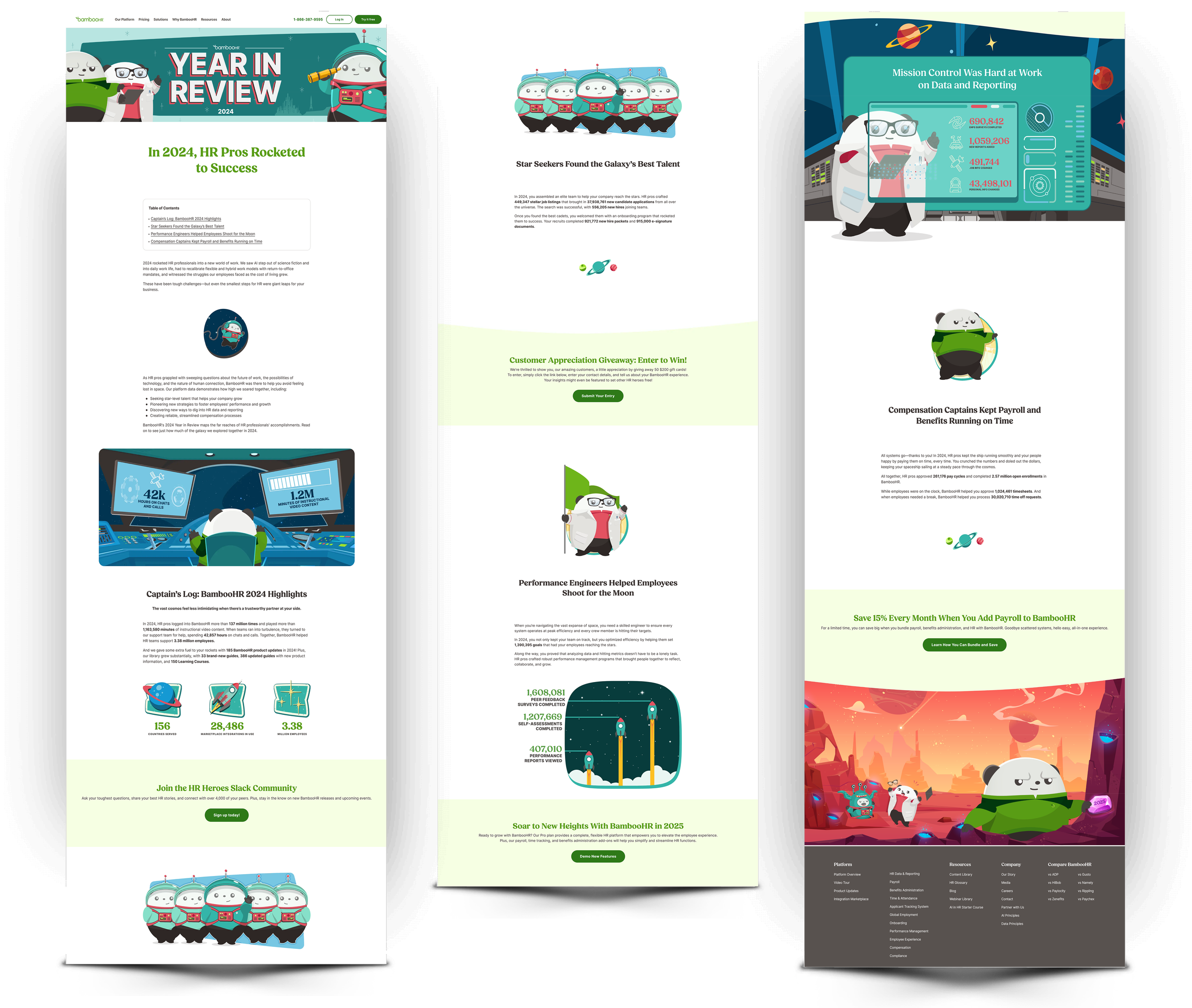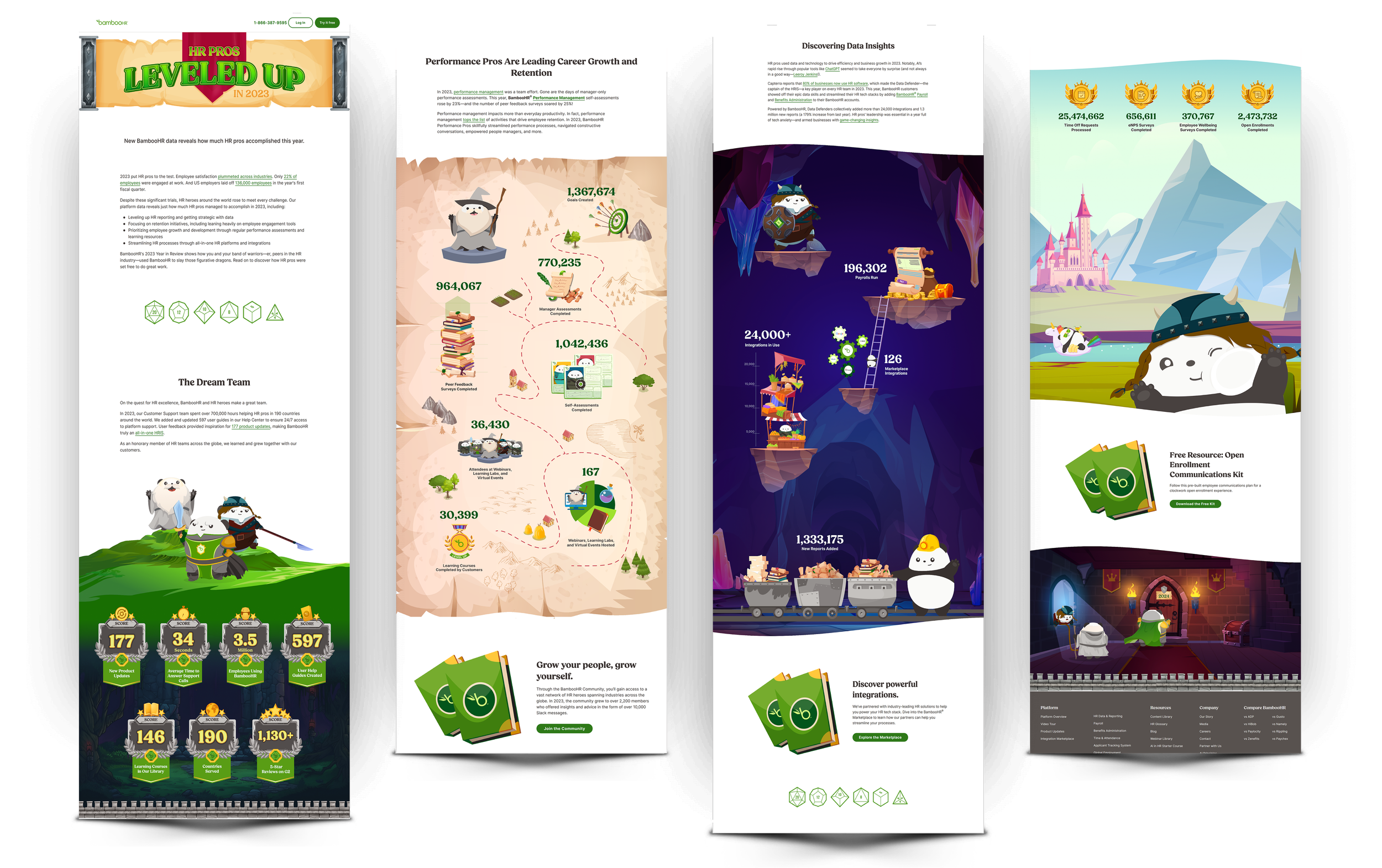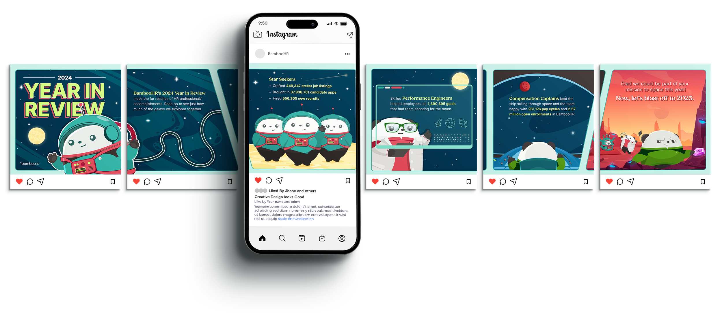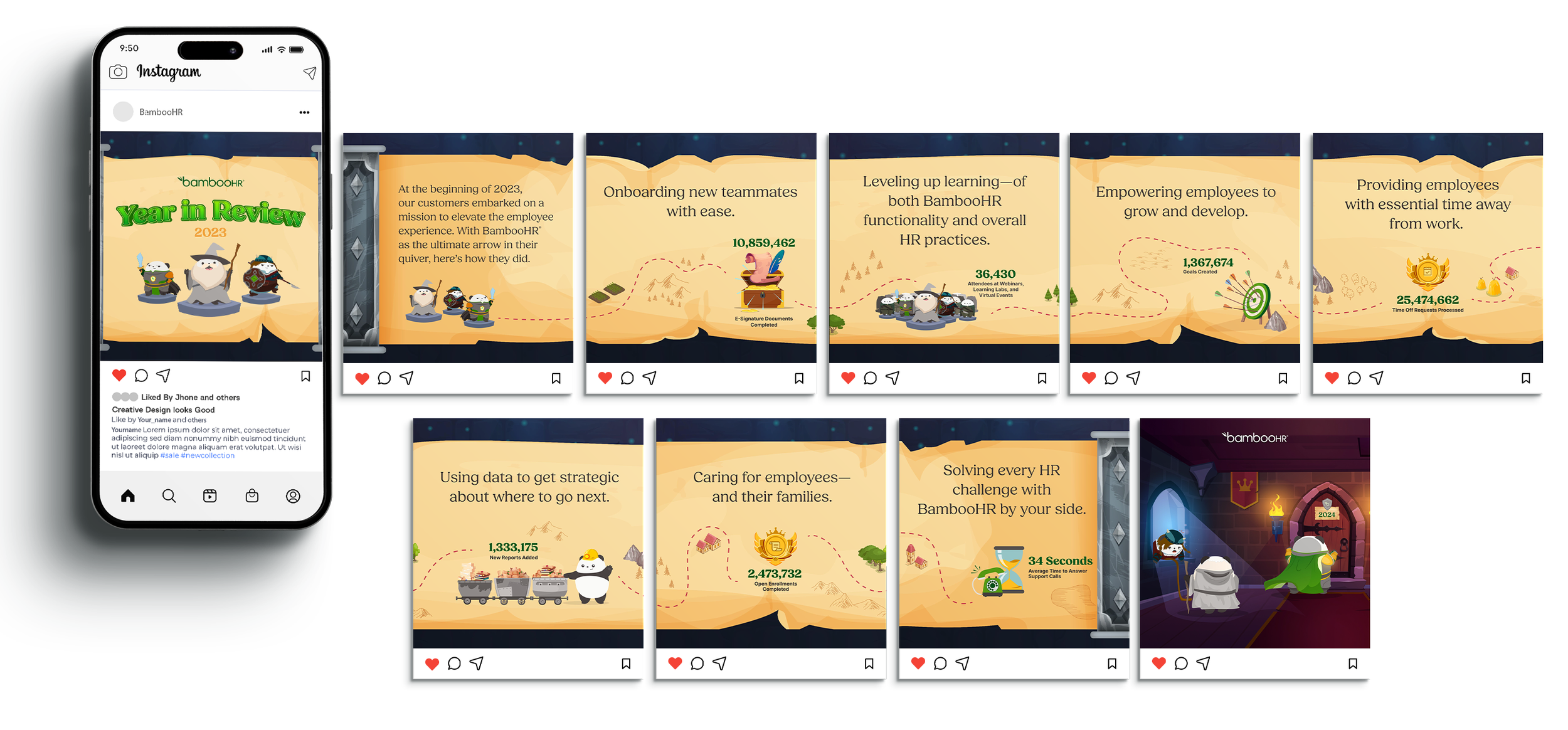 Presented here are selected mockups and deliverables from BambooHR’s Year in Review (2023 & 2024) campaign—a multi-touch initiative that transforms product and customer insights into an engaging, themed visual story. I led the design of the visual system and core assets, using our beloved mascot as a narrative guide to bring the story to life and make the data feel approachable. I translated key metrics into clear, on-brand visuals across landing page layouts, social ads, email assets, PDFs, slide decks, and swag—ensuring consistency and scalability across every touchpoint.